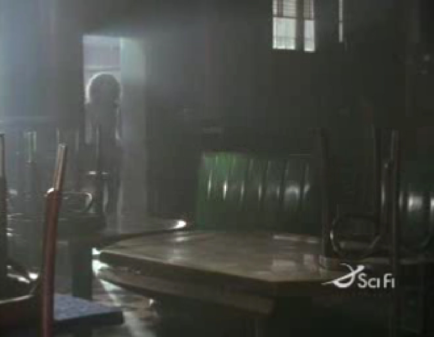 silhouette is haloed by a blinding light. Is it Vicky, the only person in this